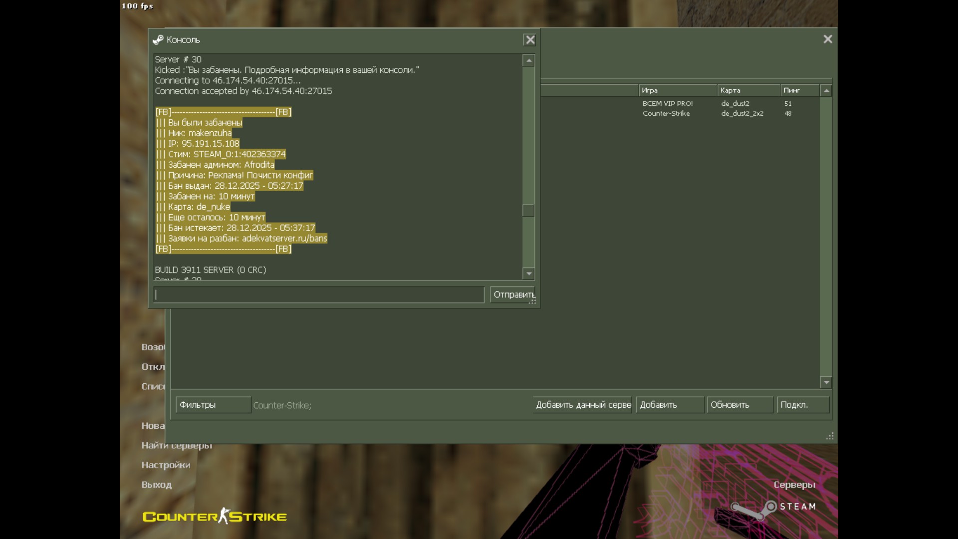 По просьбе игрока, в подозрении на читы, меня забанил данный админ. Рекламы не было, была ссылка на прохождение: Список сканов eCD